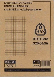 Przedmiotem tej transakcji jest: Karta profilaktycznego badania lekarskiego ucznia VII klasy szkoły podstawowej [Mz/Hsz-21] , Druk przeznaczony dla POZ-higiena szkolna, wykonany na papierze offsetowym 80 g/m, oprawiony w formie bloku o objętości 100 kartek, zawiera wszystkie aktualne informacje, które należy wpisać, numer PESEL dziecka oraz BMI. Podstawa prawna stosowania druku: Dz. U. 2013, poz. 1248 z późn. zm.