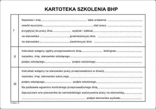Przedmiotem transakcji jest kartoteka przeznaczona do ewidencjonowania wszystkich zdarzeń związanych ze szkoleniami BHP danego pracownika oraz jego poświadczeń o odbytym szkoleniu. Instruktaż wstępny - ogólny Instruktaż wstępny na określone stanowisko pracy Instruktaże okresowe na stanowisku pracy Szkolenia kursowe Kartotek jest wykonana ze sztywnego białego kartonu offsetowego o gramaturze 250 g, nadruk w kolorze czarnym. Ka kartonie tym można pisać bez problemu każdym długopisem. Kartotek można zakupić w ilościach jednostkowych po 1 sztuce lub w opakowaniu 100 sztuk.