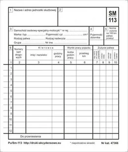Przedmiotem tej transakcji jest druk: Miesięczna karta eksploatacji samochodu osobowego [Pu/Sm-113], wykonana w formie bloku niekopiującegoo, wymiary 148 x 175 mm, objętość 100 kartek. Druk jest przeznaczony do wykonania zestawienia miesięcznej eksploatacji samochodu osobowego lub dostawczego. Zestawienie wykonuje się na podstawie kart drogowych Sm-101.