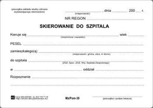 Przedmiotem tej transakcji jest druk: Skierowanie do szpitala [Mz/Pom-30] Druk niekopiujący, papier offsetowy 80 g/m, wykonany w formie bloku A6 o objętości 100 kartek. Przeznaczony dla lekarza POZ, kierującego pacjenta do szpitala. Tradycyjny wzór, znany od wielu lat. Druk nie akceptowany w procedurze NFZ, w przypadku usług refundowanych obowiązuje druk o symbolu Mz/Nfz-4 nr kat.