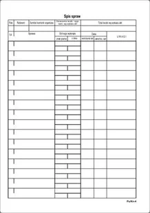 Druk służy do ewidencjonowania rozpoczętych postępowań i spraw, objętych obowiązkiem archiwizacji oraz dat ich zakończenia. Druk A4, wykonany ze sztywnego kartonika w kolorze białym, nadruk dwustronny. Nazwy rubryk: Rok Referent Symbol komórki organizacyjnej Oznaczenie teczki - sygnatura kanc.