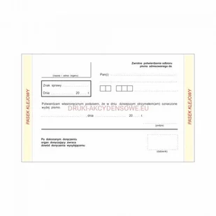 Przedmiotem tej transakcji jest druk: Zwrotne potwierdzenie odbioru KPA - egzekucja Druk stosowany w korespondencji związanej z egzekucją w związku z kodeksem postępowania administracyjnego. Druk dostępny w 2 wersjach na kartoniku z perforacją boczną i klejem - akceptowany przez Pocztę Polską wymiary 160 x 100 mm, po oderwaniu 140 x 100 mm papier biały 170 g/m (wymogi Poczty Polskiej 140-200 g/m) perforowane listwy boczne zaopatrzone w pasek klejowy o szerokości 5 mm, zabezpieczony silikonową nakładką o szerokości 10 mm, co znacznie ułatwia aplikację druku opakowanie 1000 sztuk na cienkim papierze offsetowym, bez kleju i perforacji - nie akceptowany przez Pocztę Polską . Ta wersja druku jest dedykowana dla instytucji doręczających pisma za pośrednictwem własnej służby doręczeniowej wymiary 148 x 105 mm papier biały 80 g/m (nie spełnia wymogów Poczty Polskiej) brak perforacji - zwrotką trzeba przykleić klejem, lub taśmą do koperty druk występuje jako arkusze luzem pakowane w ryzach po 1000 sztuk lub w klejony w bloki po 100 sztuk Oferowane druki ZPO mogą stosować jedynie podmioty uprawnione do prowadzenia postępowań związanych kodeksem postępowania administracyjnego. Na tym druku nie ma numeru obowiązującego dziennika ustaw Ustawa z dnia 14 czerwca 1960 roku Kodeks postępowania administracyjnego Zamów zwrotkę z pieczątką urzędu, lub własny wzór druku.