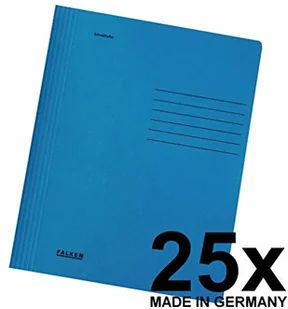25x Skoroszyt kartonowy Falken Intensivfarben. Wyprodukowano w Niemczech. Skoroszyt A4 niebieski z metalową listwą, mechanizm wpinania od góry lub od dołu. Certyfikat Błękitny Anioł