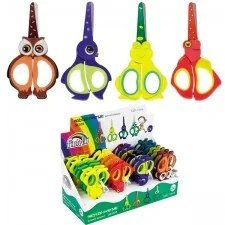 nożyczki dziecięce w atrakcyjnych kształtach imitujących zwierzaki w opakowaniu 4 wzory: żabka, pingwin, rybka, sowa w różnych wersjach kolorystycznych wygodny, miękki uchwyt ostrza ze stali nierdzewnej zaokrąglone końcówki rozmi