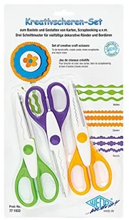 Wzory cięcia: cięcie faliste, cięcie ząbkowane i cięcie ząbkowane. Kreatywny zestaw nożyczek rzemieślniczych WEDO do dekoracyjnego cięcia krawędziDzięki temu kreatywnemu zestawowi nożyczek można uzyskać wyjątkowo ładne krawędzie podczas wycinania i być bardzo kreatywnym podczas tworzenia lub pakowania prezentów. Zestaw zawiera 3 pary nożyczek do różnych rodzajów cięcia: Jedna para nożyczek do cięcia falistegoJedna para nożyczek do cięcia ząbkowanegoJedna para nożyczek do cięcia barokowegoZnaczenie na ostrzach wskazuje, którą krawędź tnącą mają nożyczki.