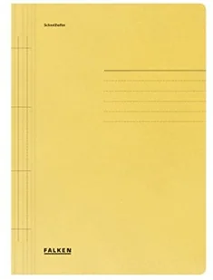 100x Skoroszyt kartonowy Falken. Wyprodukowano w Niemczech. Skoroszyt A4 żółty z metalową listwą zaciskową, mechanizm wpinania od góry lub od dołu. Certyfikat Błękitny Anioł