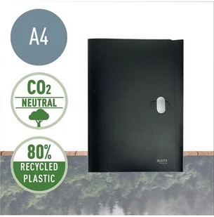 Teczka zamykana Leitz Recycle. Leitz Recycle jest kolekcją na którą składają się artykuły biurowe nadające się w 100% do ponownego przetworzenia. Duża część materiałów użytych do produkcji pochodzi z recyklingu, a prosty, uniwersalny design pozwoli z łatwością dopasować je do innych akcesoriów biurowych.