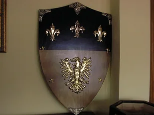 Tarcza drewniana ozdobiona stalowymi motywami dekoracyjnymi wpostaci trzech dużych i czterech mniejszych kwiatów lilii fleur-de-lis oraz wilekiego, pozłacanego orła w dolnej części tarczy.