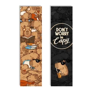Zakładka kartonowa - Don`t worry be Capy. Każda kapibara przypomina nam o tym, jak ważne jest cieszenie się małymi chwilami i znalezienie radości w prostych czynnościach Pamiętajmy o tym czytając nasze ulubione książki! Karton ozdobny perłowy 300g, sztywny, metaliczno-srebrny połysk Wymiary: