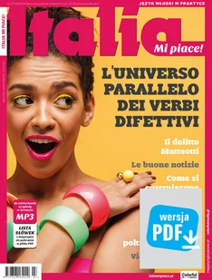W numerze: Di tutto un po’ Film: Le mani sulla città Musica: Il Volo e l’opera popo Libro: La straniera Società e costumi Il delitto Matteotti Cliccati e famosiaudio Quel pazzo mondo di Sanremo Persone e stili di vita Esistono anche le buone notizie!audio Cultura L’arte della gondola venezianaaudio Lavoro e innovazione Bistecca alla fiorentina, orgoglio tutto toscano!audio Viaggio 5 idee per una vacanza alternativa in Italiaaudio Norcia, arte e tartufi all’ombra del terremoto Lingua Quella poltrona infernale! Come mettere in difficoltà gli italiani? Semplice, usate i difettivi!audio Che cosa ricordate di Italia mi piace? Wybrane artykuły zostały nagrane i można je ściągnąć ze strony magazynu w formie plików mp3! Italia Mi piace! to kwartalnik tworzony przez włosko-polski zespół specjalnie dla wszystkich zainteresowanych nauką języka włoskiego. Magazyn jest ciekawym urozmaiceniem nauki języka włoskiego na poziomie średnio zaawansowanym i zaawansowanym.