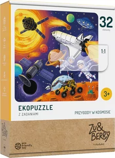 32-elementowy zestaw puzzli ukazujący dwoje dzielnych, młodych astronautów w kosmosie. Układanie puzzli jest dobrym narzędziem wspomagającym motorykę małą u dzieci. Daje okazję do rozmowy o tym, jak wielka jest przestrzeń kosmiczna i jakie próby odkrycia kosmosu podejmują ludzie. Do zestawu dołączone są zadania, które pozwalają ćwiczyć umiejętności liczenia i właściwego nazywania obiektów. Pomocnikami w zabawie są surykatka Zu i alpaka Berry (tekturowe figurki do samodzielnego złożenia).