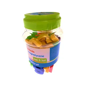 W przeźroczystym słoiczku znajduje się 52 sztuk literek, cyferek oraz znaków magnetycznych do nauki tabliczki mnożenia. Słoiczek zakręcany przykrywką z ruchomym uchwytem.