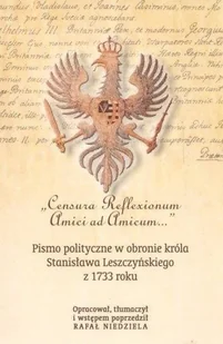 "Censura Reflexionum Amici ad Amicum. . . " to jedna z najobszerniejszych, a zarazem najmniej znanych publikacji przedostatniego bezkrólewia w Rzeczypospolitej. Jej autora zainspirowały wydane wówczas inne pisma o wydźwięku jednoznacznie antysaskim i antyfrancuskim: Przestroga Braterska w teraźniejszym podczas interregnum Ojczyzny autorstwa Stanisława Leszczyńskiego oraz Refleksyje przyjaciela do przyjaciela nad Przestrogą Braterską Jana Aleksandra Lipskiego. Niniejsza książka oprócz starannej edycji pisma Censura Reflexionum Amici ad Amicum zawiera także te dwa pozostałe teskty.