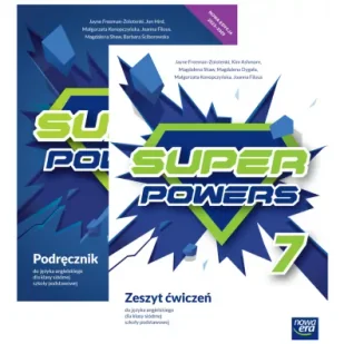 Super Powers 7 NEON. Podręcznik do języka angielskiego dla klasy siódmej szkoły podstawowejNowa Edycja 2023-2025Praca z podręcznikiem Super Powers 7 to: realizacja wszystkich zagadnień z podstawy programowej już w klasie siódmej, dzięki czemu w klasie ósmej uczniowie mogą skoncentrować się na powtarzaniu materiału i przygotowaniu do egzaminu ósmoklasisty,unikatowy 8. rozdział Closer, który powtarza materiał z całego roku, a nauczyciel decyduje, w jakim zakresie będzie z niego korzystał,ćwiczenia w formacie egzaminacyjnym w każdej lekcji,rozłożenie treści gramatycznych na dwie lekcje w rozdziale, wsparte przez wyjaśnienia w języku polskim i filmy gramatyczne,możliwość pracy z grupami o zróżnicowanym poziomie dzięki podziałowi na słownictwo podstawowe i rozszerzone oraz oznaczeniu ćwiczeń wg. stopnia trudności,rozbudowany program nauki pisania, obejmujący wszystkie formy z informatora egzaminacyjnego CKE,rozrywka, dzięki wykorzystaniu gier, projektów edukacyjnych i lekcji z udziałem vlogerów,pomoc w najtrudniejszych dla ucznia dziedzinach – gramatyce i pisaniu – dzięki dodatkowym sekcjom Grammar Bank i Writing Bank.