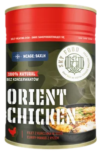 Naturalny i egzotyczny posiłekORIENT CHICKEN to samopodgrzewające danie gotowe marki SKY FOOD, przygotowane w 100% z naturalnych składników, bez konserwantów i sztucznych dodatków. Soczysty kurczak w aromatycznym sosie curry mango połączony z delikatnym ryżem tworzy pełnowartościowy, sycący posiłek, który dostarcza energii i wysokiej wartości odżywczej. Danie oferuje egzotyczny smak kuchni orientalnej w wygodnym formacie, idealnym do domu i w terenie. Certyfikowana jakość – NCAGE NATO i normy armiiProdukty SKY FOOD posiadają kod NCAGE NATO i spełniają normy jakości armii na całym świecie, co gwarantuje niezawodność, trwałość i bezpieczeństwo spożycia. ORIENT CHICKEN to danie gotowe, które zachowuje smak i aromat nawet w trudnych warunkach, idealne dla osób aktywnych, podróżników i służb mundurowych.