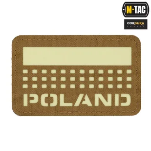 Naszywka przedstawiająca flagę Polski z napisem "Poland" w nowoczesnym militarnym stylu. Naszywka wykonana jest z wytrzymałego tworzywa Cordura 500D oraz materiału fluorescencyjnego delikatnie świecącego w ciemności. Nadaje się idealnie do personalizowania odzieży i akcesoriów wyposażonych w panele z rzepem.