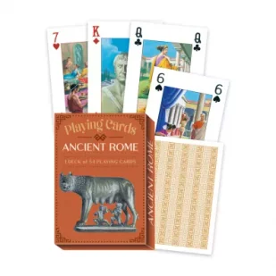 Odkryj starożytną cywilizację, która ożywa na tych teatralnych obrazach! Wspaniali wojownicy, dumni cesarze, utalentowani rzemieślnicy oraz zwykli obywatele przedstawiają nam cuda Rzymu. Przenieś się w czasie do Rzymu, który kiedyś istniał, i zachwyć się jego niezwykłymi osiągnięciami!Karty do gry Rzymskie Opowieści to zestaw 54 kart, które zostały zaprojektowane tak, aby wciągnąć Cię w fascynujący świat antycznego Rzymu. Każda karta, o wymiarach 88 x 58 mm, jest pokryta plastikową warstwą, co zapewnia trwałość i elegancki wygląd. W zestawie znajdziesz karty w różnych kolorach, które z pewnością przyciągną wzrok każdego gracza. Te karty są idealne do: