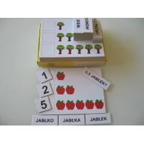 Ile$20 -poprzez dołożenie etykietek lub wypowiedź.Uczy czytania pełnymi wyrazami (czytanie globalne) niektórych liczebników i rzeczowników.Zestaw zawiera: