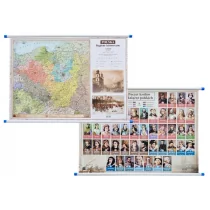 Dwustronna mapa ścienna Polski oprawiona w rurki PCV i sznuerk. Obustronnie laminowana, zawiera mapę regionów historycznych Polski oraz poczet królów i książąt polskich. Można po niej pisać pisakiem suchościeralnym....