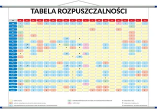 Tabela rozpuszczalnośći 1400 x 1000 mm - to plansza dydaktyczna obrazująca rozpuszczalność związków, które komponuje się z umieszczonych na jednej z osi kationów, na drugiej anionów. Zawiera bardzo czytelne informacje o charakterze rozpuszczalności w wodzie, tj.: związek jest dobrze rozpuszczalny w wodzie, wytrąca się osad, wytrąca się osad z roztworów stężonych, zachodzą skomplikowane reakcje chemiczne.