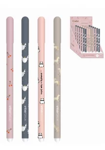 Opakowanei zbiorcze 36szt. Grubość pisania: 0,5 mm. Zamykany na skuwkę. Niebieski wkład. Zakończony gumką, która umożliwia szybką i estetyczną korektę napisanego tekstu, bez użycia korektora czy przekreślania. Obudowa w 4 słodkich, dziewczęcych wzorach. 36 szt. w displayu. Te same motywy znajdziesz również na naszych ołówkach, gumkach i akcesoriach papierniczych - stwórz swój niepowtarzalny zestaw!