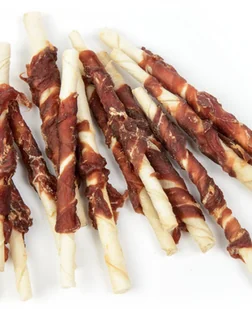 Przysmak dla psa ALDA kabanos zwijany z kaczki 500g Podstawowe cechy produktu: Zawijany mięsem kaczki 96,5% mięsa! Zalecana jest dla psów z delikatnym przewodem pokarmowym Jest lekkostrawne i dostarcza mało tłuszczu Skóra wieprzowa zawiera bardzo dużo kolagenu – wzmocnienie stawów i kości Zaspokaja potrzebę gryzienia i żucia Zapewniają doskonałą zabawę na dłużej dodatkowo czyszcząc zęby i wzmacniając dziąsła Patyczek ze skóry wieprzowej to bezpieczny sposób na czyszczenie zębów z kamienia i resztek pokarmowych, polecany szczególnie dla małych i średnich ras. Dodatkowy przysmak jest lekkostrawny, dzięki temu bezpieczny dla psów z tendencją do niestrawności. Skóra wieprzowa jest bogata w kolagen, który ma właściwości wzmacniające stawy i kości. Skład: Mięso z kaczki (51.5%), skórki wołowe (45%), gliceryna, sorbital, sorbinian potasu, sól (3.5%).