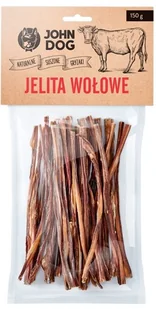 John Dog Jelita wołowe 150g Podstawowe cechy produktu: Miękka konsystencja świetnie sprawdzi się u młodych psów i szczeniąt W 100% naturalne, bez środków chemicznych i konserwujących Dba o uzębienie twojego pupila, usuwając kamień nazębny i wspomagając pracę żuchwy Unikalny aromat sprawi, że twojemu psu trudno będzie mu się oprzeć Smakołyk jest w 100% wyprodukowany z polskich jelit wołowych, poddane procesowi suszenia w stosunkowo niskich temperaturach, zapewnia zachowanie cennych wartości odżywczych użytych składników. Natomiast w produkcji wędzenia nie osiadają na nim żaden popiół, a pasteryzacja termiczna zapewnia całkowite bezpieczeństwo epidemiologiczne, bez użycia środków chemicznych i konserwujących . Przysmak jest w 100% naturalny i posiada bardzo dużą zawartość białka zwierzęcego, które jest szczególnie ważne w diecie szczeniąt do prawidłowego wzrostu i rozwoju. Do tego, nie od dziś wiadomo jak ważną częścią życia naszych pupili jest gryzienie, jeśli nie dostanie on odpowiednich gryzaków, zacznie żuć wszystko co znajdzie się w zasięgu jego zębów.