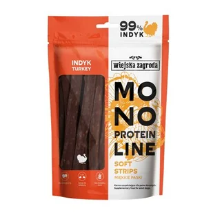 WIEJSKA ZAGRODA Monoproteinowe Miękkie Paski Indyk to wyjątkowa karma uzupełniająca, stworzona z myślą o dorosłych psach, które potrzebują lekkostrawnych i wartościowych przekąsek. Dzięki zastosowaniu jednego źródła białka – mięsa z indyka – oraz eliminacji zbóż i roślin strączkowych, przysmaki minimalizują ryzyko alergii pokarmowych i problemów trawiennych. Zawartość 99% mięsa i składników zwierzęcych sprawia, że produkt jest bogaty w białko wspierające zdrową masę mięśniową oraz energię potrzebną do codziennej aktywności. WIEJSKA ZAGRODA Monoproteinowe Miękkie Paski Indyk – idealna nagroda i wsparcie diety