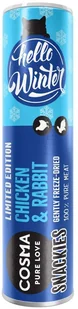 Koty uwielbiają Cosma Snackies! Cosma Snackies Edycja zimowa oferuje naturalną i podwójną przyjemność. W każdym opakowaniu znajdują się dwa pyszne warianty smakowe: 100% kawałków delikatnej piersi z kurczaka i pożwnego mięsa królika. Składniki te są poddawane procesowi liofilizacji, co pozwala na zachowanie wszystkich najważniejszych składników naturalnych i odżywczych. Edycja zimowa: