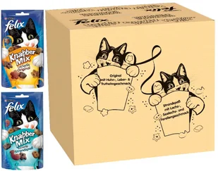 dwa smaki (Felix KnabberMix Original i Felix KnabberMix Seaside). Wartościowe składniki: zawiera witaminy, składniki mineralne i kwasy tłuszczowe omega 6. Źródło białka: zawiera naturalne źródła białka.