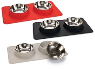 Obrzeże silikonowe z podniesioną krawędzią. Materiał: Miski: stal szlachetna; Obrzeże: silikon. Wymiary: Przekątna: 2 x O 14 cm; Pojemność: 2x 350 ml. Kolor: czarna / czerwona / jasnoszary. Informacje dot.