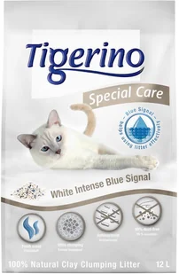 Tigerino Special Care - White Grain to higieniczny żwirek dla kota z systemem "Blue-Signal". Jego działanie polega na zmianie barwy znajdujących się w żwirku ziaren sygnalizujących podczas kontaktu z cieczą z koloru niebieskiego na ciemnogranatowy. W ten sposób powstałe grudki są dobrze widoczne, co umożliwia łatwe czyszczenie i pozwala na wydajne korzystanie ze żwirku. Ochronę przeciwbakteryjną zapewnia tzw. technologia Aromaguard, która hamuje powstawanie bakterii i nieprzyjemnych zapachów.
