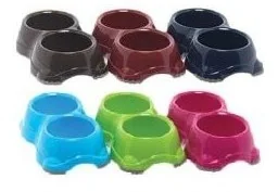 Podwójna miska plastikowa z gumowymi zakończeniami, które sprawiają że miska nie przesuwa się podczas jedzenia przez czworonoga.