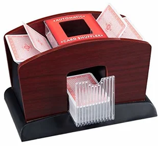 Łatwe tasowanie kart! Dzięki tej elektrycznej maszynie do tasowania kart tasowanie podczas następnego wieczoru gier jest dziecinnie proste. 4 paczki kart są wkładane do tac wejściowych i tasowane na tacy wyjściowej za naciśnięciem jednego przycisku. W przyszłości oszukiwanie nie będzie już możliwe. Zasilany bateryjnie shuffler do kart nadaje się do standardowych kart do gry w pokera, rommee i wielu innych, a dzięki nowoczesnemu drewnianemu designowi ma wysokiej jakości i elegancki wygląd. Tasowarka do kart4 talie w szczegółach- Rozmiar tasowarki do kart wys.