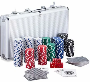 x szer. x gł. : ok. 9 x 6,5 x 2 cm - Średnica żetonów: ok. 4 cm, waga: ok. 11,5 g - Materiał: aluminium, plastik - Kolory: czerwony, zielony, niebieski, biały, czarny, srebrny Gra w pokera "All In" - Na ekscytujące wieczory z przyjaciółmi - Wszechstronny zestaw dla początkujących i zaawansowanych graczy - Praktyczne zamykane etui do transportu - Wysokiej jakości laserowe żetony (100 x białe, 50 x czarne, niebieskie, zielone, czerwone) - Karty do gry z międzynarodowym wzorem Zakres dostawy - 300 x żetonów pokerowych - 5 x czerwone kości do gry - 2 x paczki kart (po 54 karty każda) - 2 x klucze - 1 x przycisk krupiera - 1 x aluminiowa walizka - Elementy dekoracyjne nie wchodzą w zakres dostawy