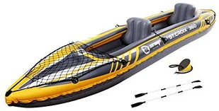 Dzięki temu zaworowi kajak będzie gotowy do użycia w ciągu kilku minut, dzięki czemu będziesz mógł spędzić więcej czasu na wodzie, a mniej na przygotowaniach!Dmuchany kajak wykonany jest z litego PCV o grubości 0,55 mm, co zapewnia jego długą żywotność i odporność na uszkodzenia. Po napompowaniu ma około 350 cm długości, 78 cm szerokości i 52 cm wysokości. Maksymalne obciążenie kajaka wynosi 160 kg, co jest idealne dla dwóch osób. Dla większego bezpieczeństwa kajak wyposażony jest w dwie komory powietrzne na kadłubie, dzięki czemu można bezpiecznie dopłynąć do brzegu nawet w przypadku przebicia jednej warstwy. Uchwyty na wiosła zapewniają, że wiosła są zawsze na swoim miejscu i są łatwo dostępne.