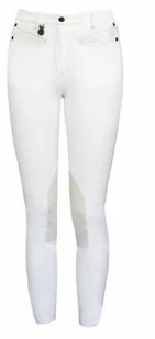 Eleganckie bryczesy konkursowe wykonane z najwyższej jakości materiału. Elastyczne i wygodne, świetnie dopasowują się do kształtu sylwetki. Posiadają ciekawie wykończone przednie kieszonki oraz szaro-różowe przeszycia. Nogawki zakończone rzepami. Kolor: białyRozmiary: