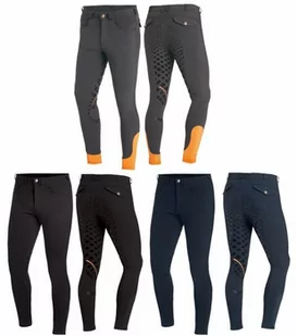 Nowoczesne bryczesy męskie firmy Schockemohle. Posiadają silikonowy lej, poprawiający przyczepność do siodła. U dołu elastyczna wstawka z siateczki, świetnie przepuszczającej wilgoć. Z przodu posiadają ukośne kieszonki, z tyłu elegancji dodają dwie kieszonki z guzikami. Kolor: navy (granatowy)black (czarny)grey/orange (szary).