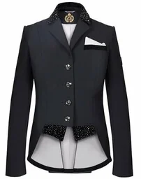 Elegancki i bardzo szykowny krótki frak ujeżdżeniowy przeznaczony do startów na młodych koniach. Wykonany z wysokiej jakości oddychającego, wodoodpornego i wiatroszczelnego softshellu. Ozdobiony welurowymi wstawkami, efektownymi haftami i dżetami. W komplecie chustka do butonierki i dodatkowe dolne klapki bez dżetów. Kolory: czarnygranatowy Rozmiary: