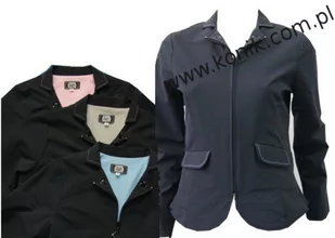 Kolor marynarki: czarny z kontrastowymi szwami i podszewką Kolor kontrastu: różowybłękitnyMateriał: softshell 100% poliester. wymiary: 36 - szerokość pod pachami-45cm, długość-62cm, dł.