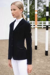 Frak młodzieżowy ISALIENNE - Pikeur Wykonany z oddychającej i odprowadzającej wilgoć tkaniny Tech-Jersey. Jest bardzo elastyczny, dzięki czemu dopasowuje się do sylwetki, nie ograniczając przy tym ruchów. Posiada wydłużane rękawy, które można powiększyć o nawet 5cm!Dodatkowo elegancji dodają marynarce zdobienia na kołnierzu i plecach. Kolor: black - czarny . . .