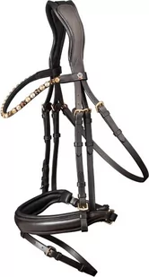 Ogłowie X-Line Goldheart firmy Waldhausen. Anatomicznie ukształtowany pasek potyliczny. Miękko podszyte w części nosowej oraz potylicznej. W zestawie wodze o szerokości 19mm. Okucia ze stali nierdzewnej.