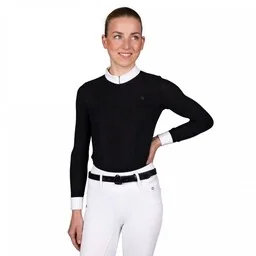 Koszulka damska konkursowa Juliet AW 24/25 - QHPWykonana z eleganckiego materiału z brokatowymi drobinkami. Elastyczna tkanina zapewnia wysoki komfort noszenia. Stójka oraz mankiety w kolorze białym. Pod szyją zapinana na zamek błyskawiczny. Można prać w pralce w temperaturze 30 stopni.