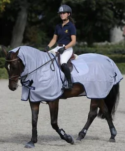 Derka siatkowa treningowa BUZZ-OFF RIDING - Bucas - silver/navyWykonana z drobnej, oddychającej siateczki poliestrowej. Lekka i przewiewna, chroni ciało konia przed upierdliwymi owadami podczas treningów. Posiada pasek mocujący do głowy konia, dzięki któremu kołnierz nie przesuwa się w dół. Z możliwością odpięcia kołnierza. Szeroka klapa na ogon chroni zad konia.