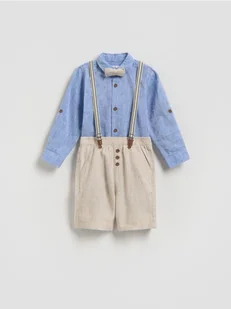 Zestaw składający się z koszuli, szortów, szelek oraz muszki, wykonany z bawełny i lnu.