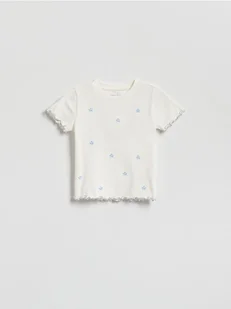 Reserved - Prążkowany t-shirt z haftem - złamana biel