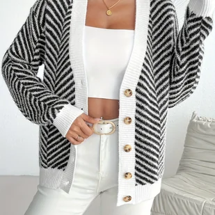 Kardigan z guzikami z przodu w jodełkę, swobodny kardigan z długim rękawem i dekoltem w szpic, opadającym na ramiona, na jesień i zimę, odzież damska