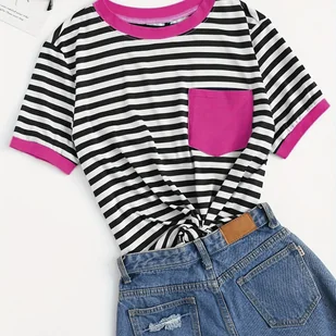 Koszulka z krótkim rękawem z nadrukiem w paski, luźna koszulka z kieszonką na wiosnę i lato, odzież damska