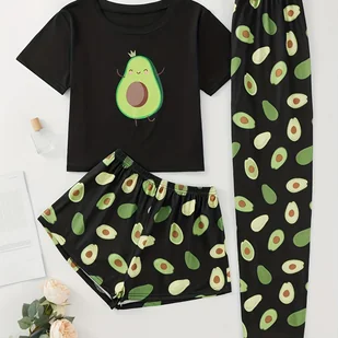 Piżama damska z uroczym nadrukiem awokado, krótki rękaw, okrągły dekolt, top i szorty i spodnie, wygodny, luźny krój