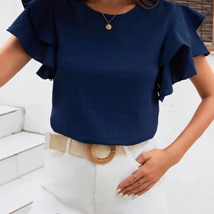 Solidna Teksturowana Bluzka Z Okrągłym Dekoltem, Elegancka Warstwowa Bluzka Z Falbaną Na Wiosnę I Lato, Odzież Damska